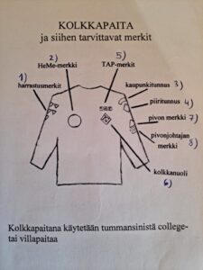 Kolkkapaidan rintaan oikealle puolelle ommellaan lippukunnan kankainen tunnusmerkki (2). Vasemmalle puolelle rinnan korkeudelle tulee kolkkanuoli (6). Nuolen pää osoittaa ylöspäin. Kolkkanuolen yläpuolelle tulee kolkkien suoritusmerkit eli TAP-merkit (Teen Aina Parhaani) (5).